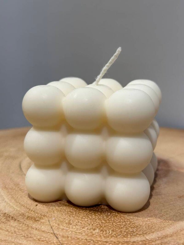 Medium Bubble cube candle. Bubble candles are a popular trend in home decor, known for their minimalist yet beautiful, artistic designs. They can be used as a centerpiece or accent in various rooms, from living rooms to offices, to "turn it into your centerpiece" and radiate a sense of good taste. Their distinctive shape, often a cube or ball, provides a unique visual appeal that stands out from traditional candles. By choosing a specific scent, you can "personalize it... to make it truly yours and add a touch of warmth and comfort to any room".