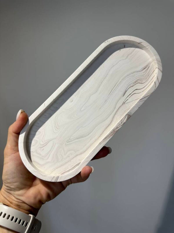 A Jesmonite oval tray is a decorative dish made from Jesmonite, an eco-friendly composite material, and features a distinctive ribbed or fluted texture. It is a versatile home accessory used for holding items like jewelry, keys, or candles, and is known for its modern, minimalistic aesthetic.