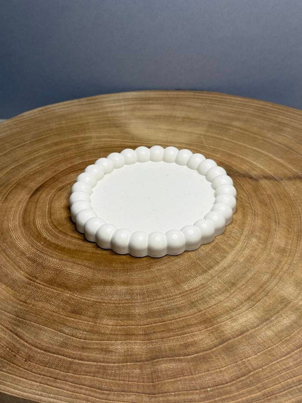 A Jesmonite round bubble tray is a decorative dish made from Jesmonite, an eco-friendly composite material, and features a distinctive ribbed or fluted texture. It is a versatile home accessory used for holding items like jewelry, keys, or candles, and is known for its modern, minimalistic aesthetic.