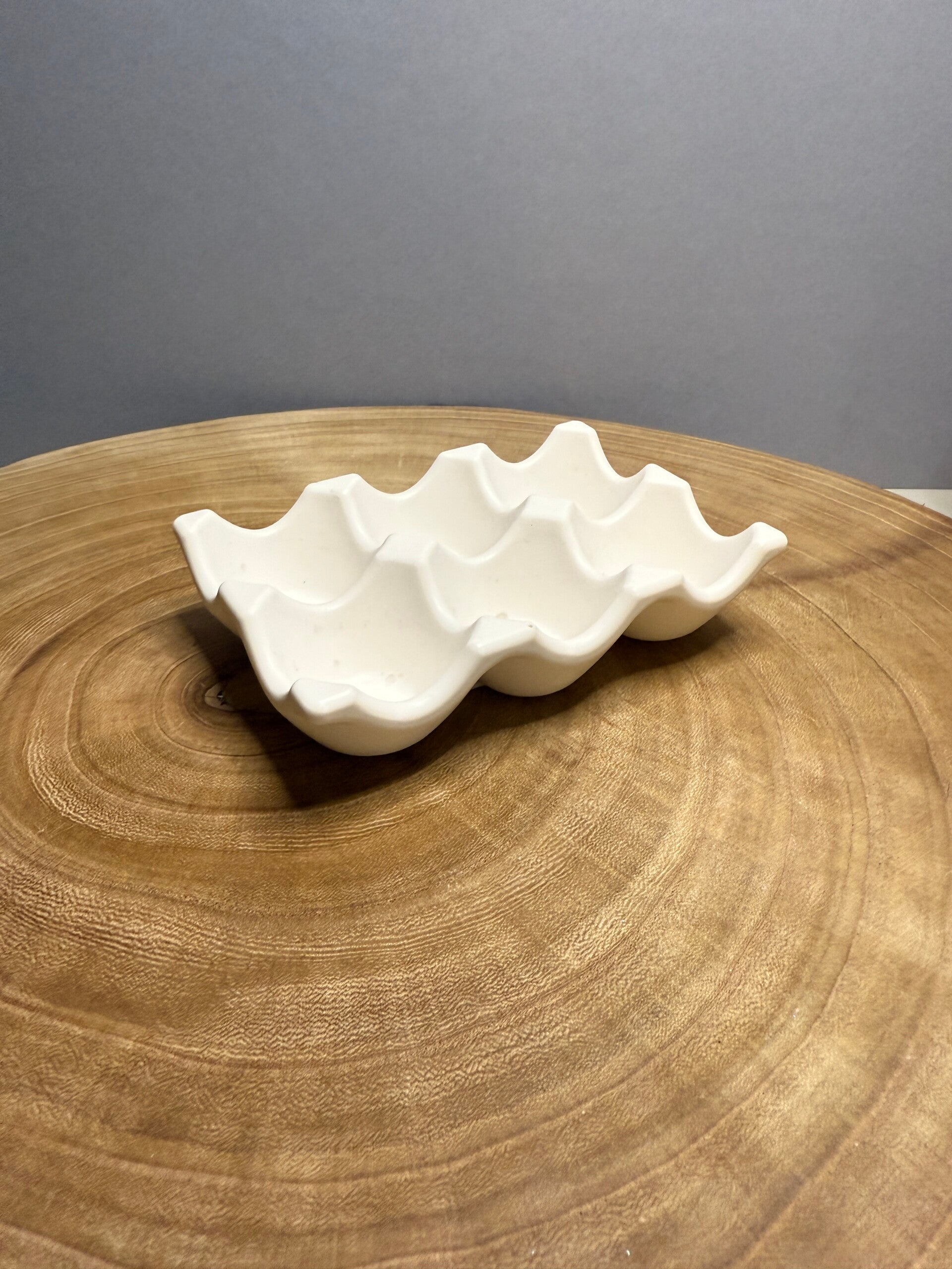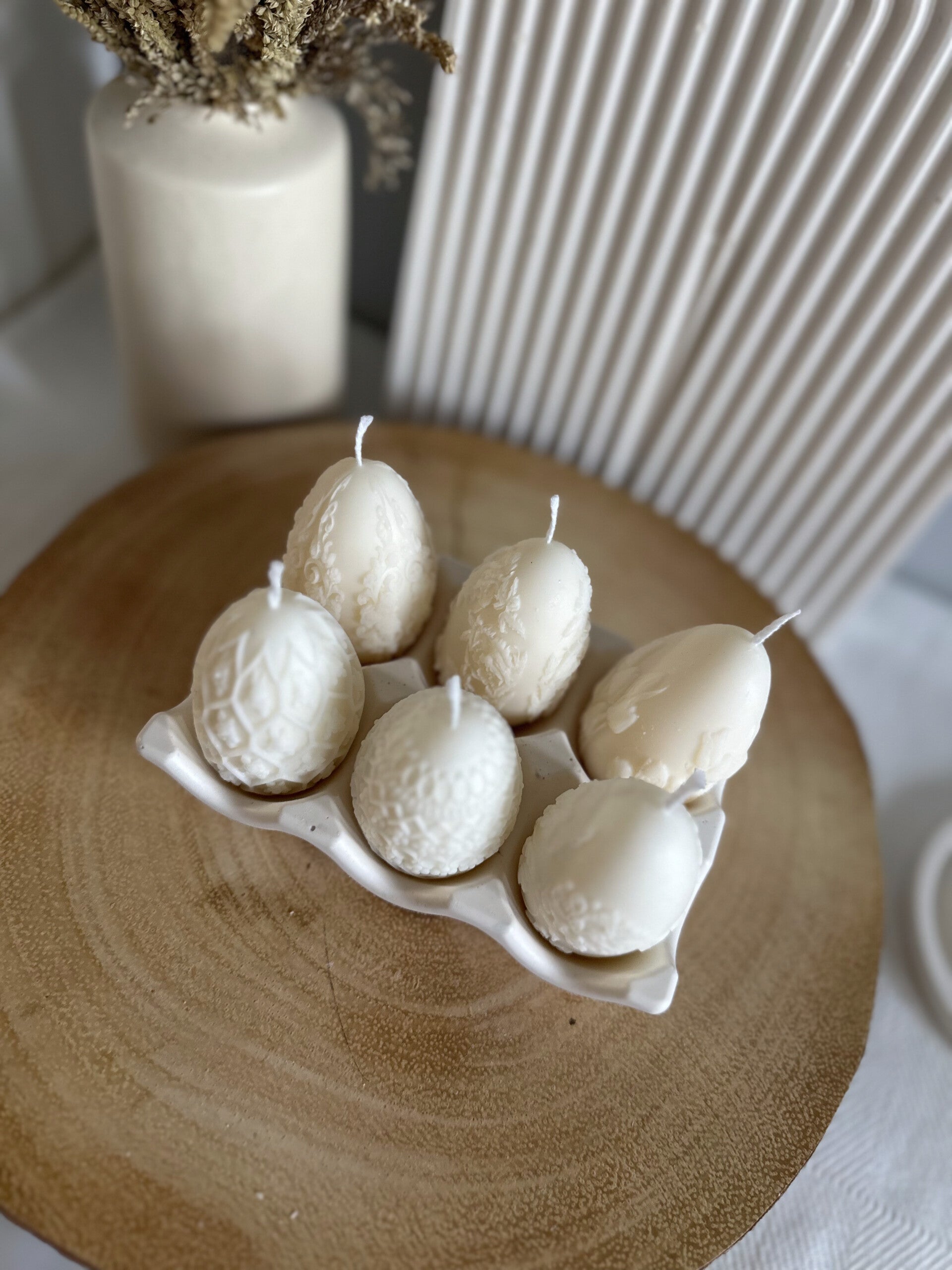 Decorative Egg Tray. A "jesmonite egg tray" likely refers to a decorative candle set featuring a candle housed in an egg-shaped container made from jesmonite, a composite material, often combined with an egg tray. Bring symbolic qualities into a living space, such as new beginnings, abundance, or spring.
