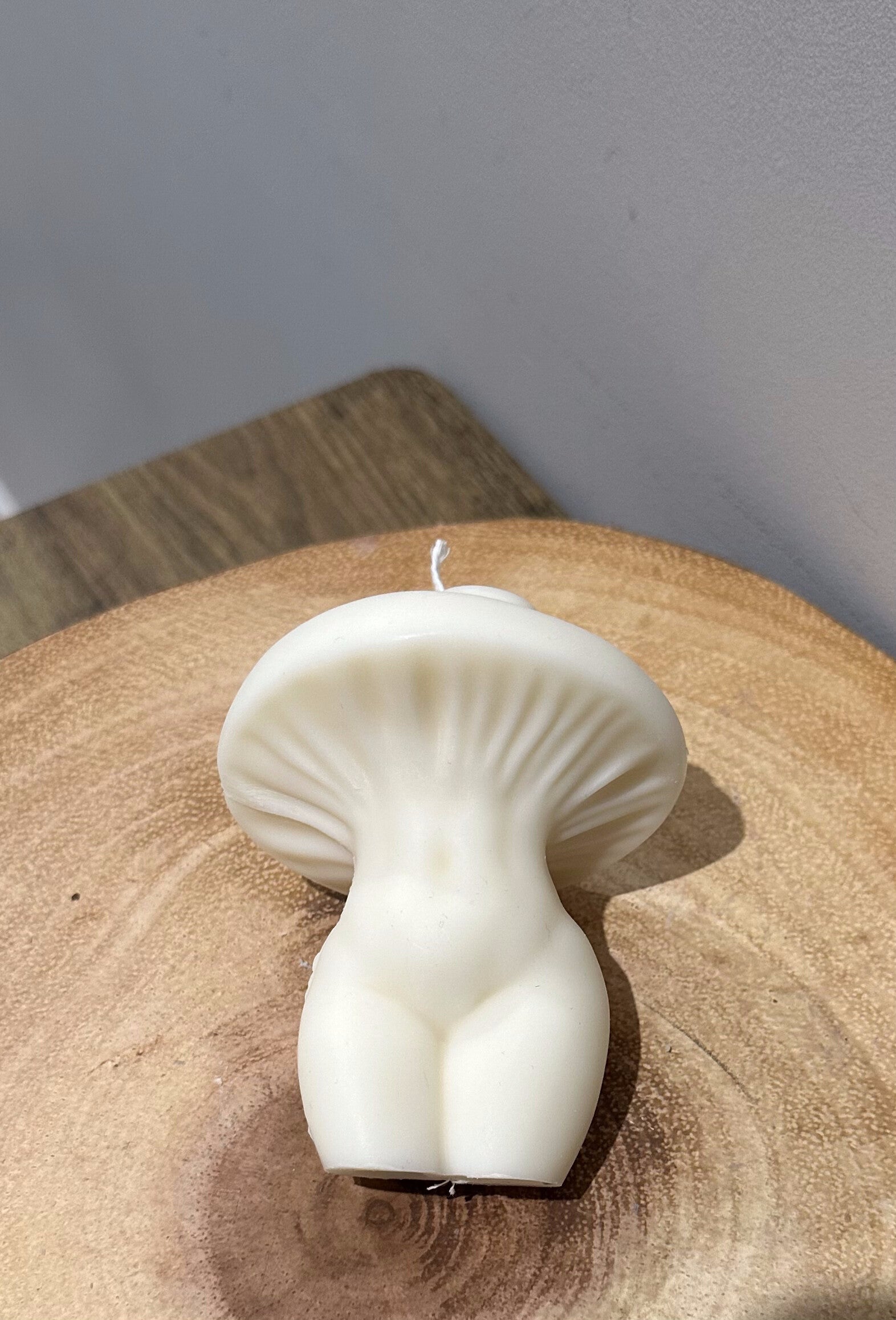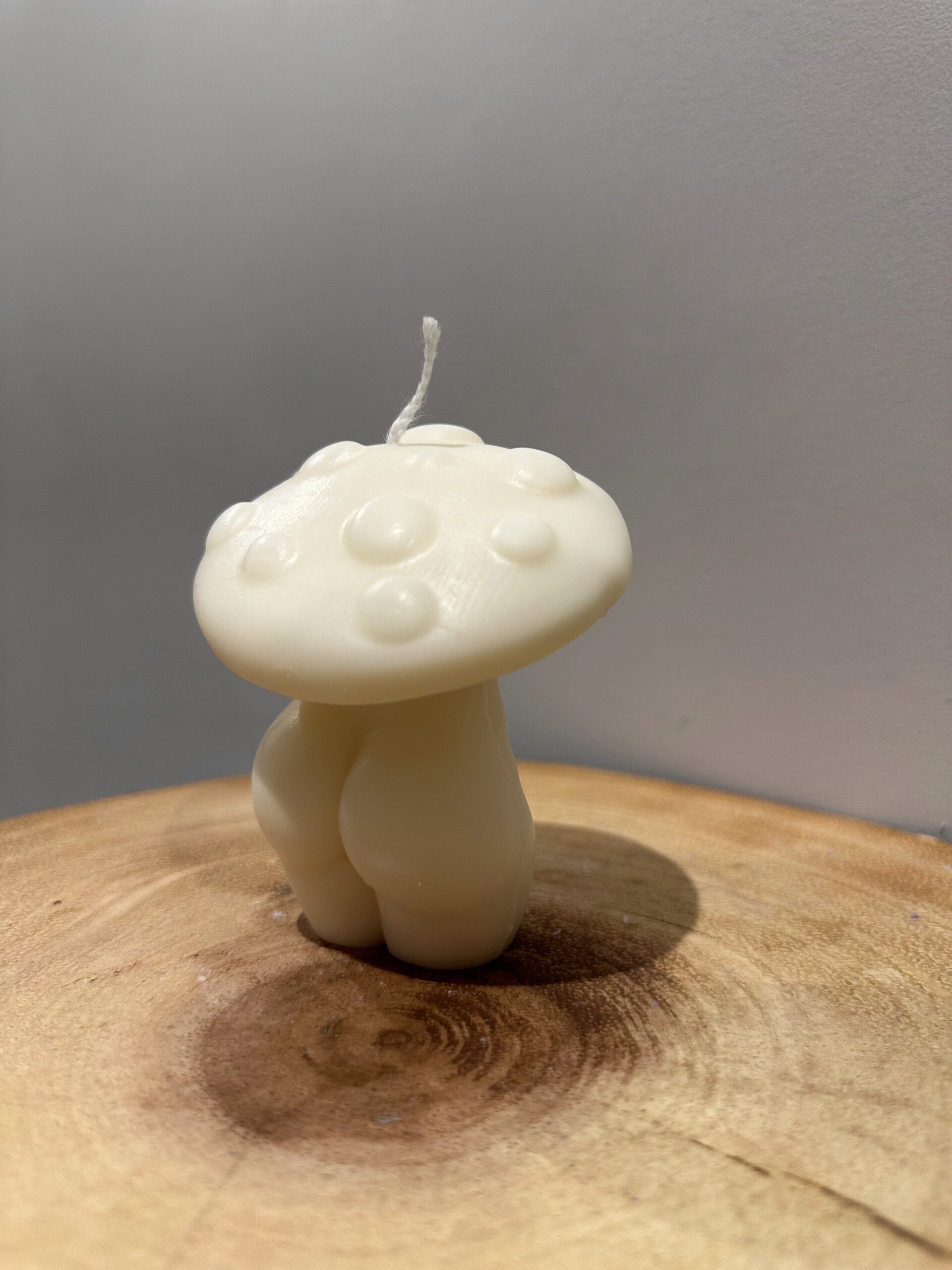 A lady mushroom candle in a home serves as both decorative art and a symbol of mysticism and nature, often associated with the goddess, transformation, fertility, and good luck.
