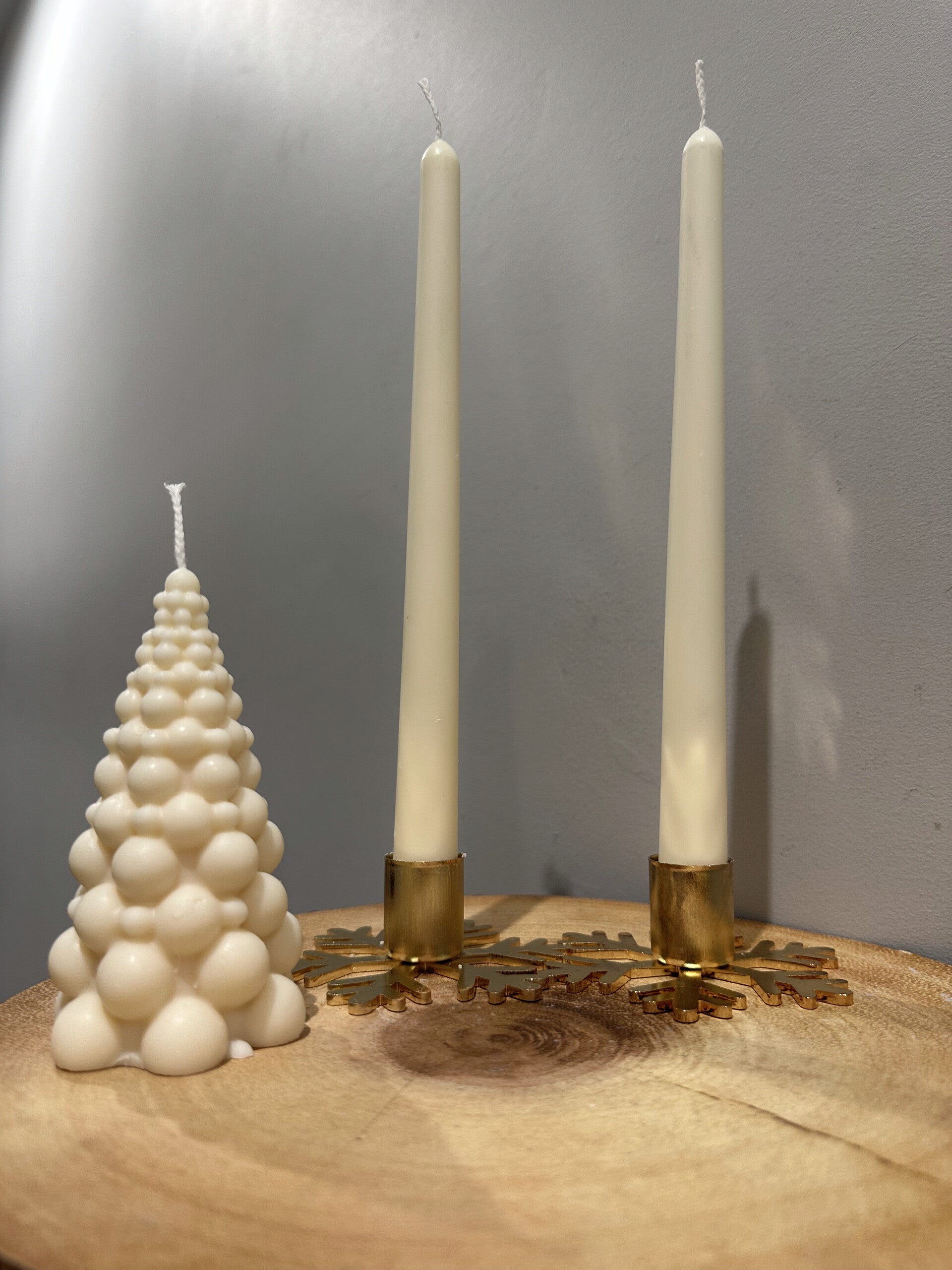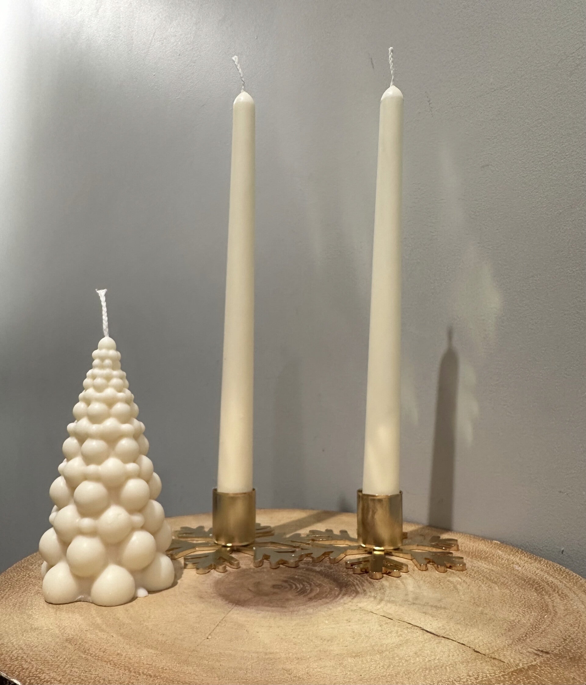 A taper candle is a long, slender, cylindrical candle that gradually decreases in diameter from its base to a narrow tip, hence its "tapered" shape. These traditional candles are designed to fit into candlesticks or candelabras, requiring a holder to stand upright, and are commonly used for formal events, dinner parties, and to create a sophisticated ambiance in homes.