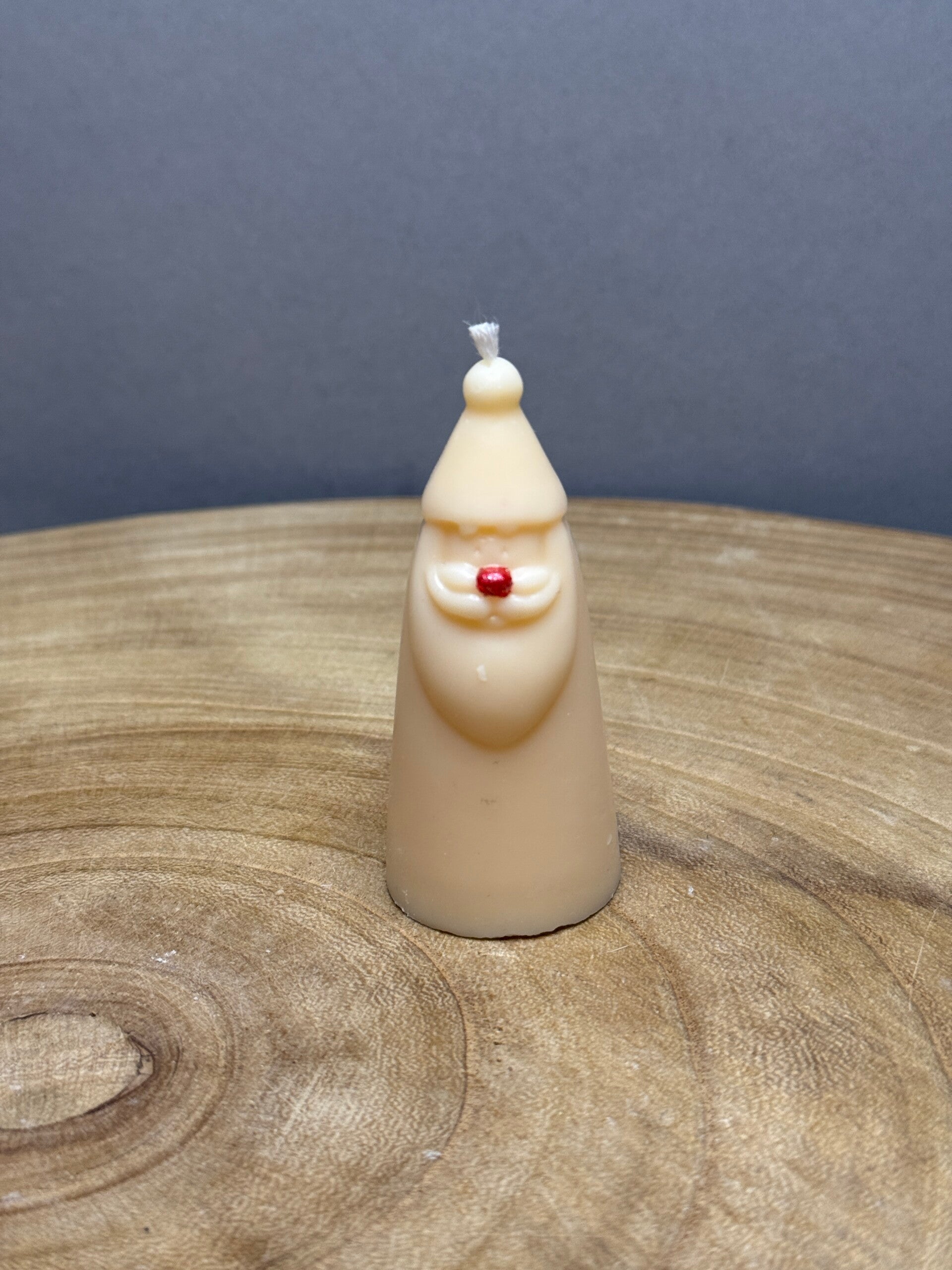 Santa-themed candle adds a secular, joyous, and nostalgic element, representing holiday spirit and warmth to your table.