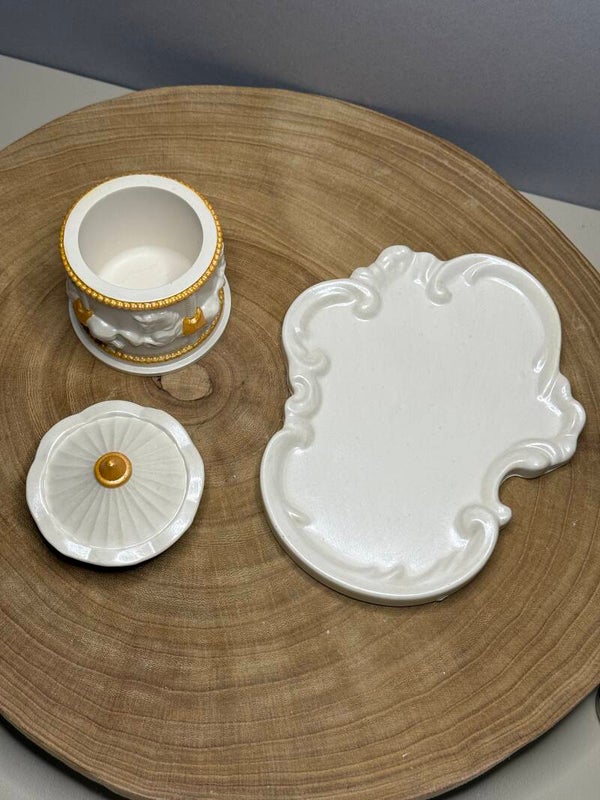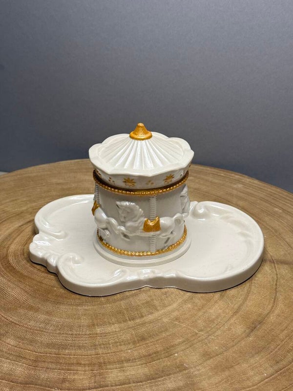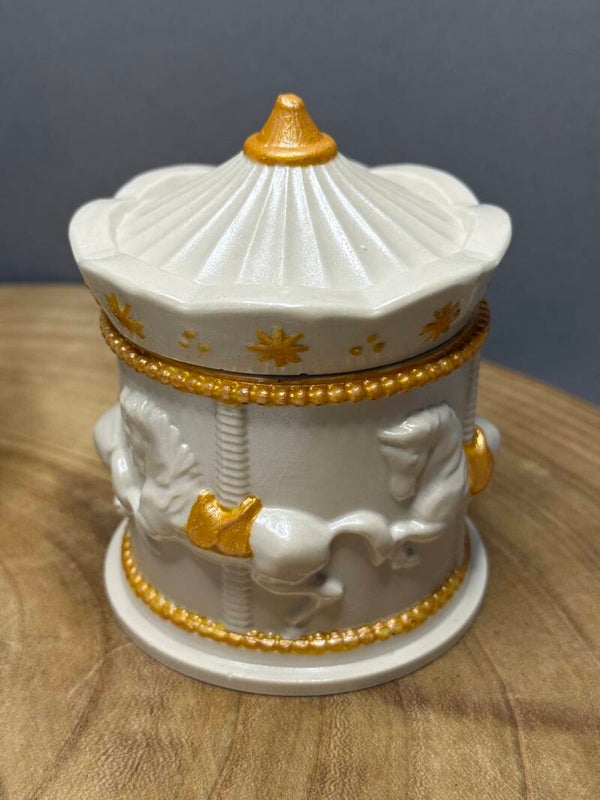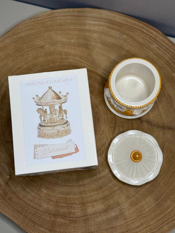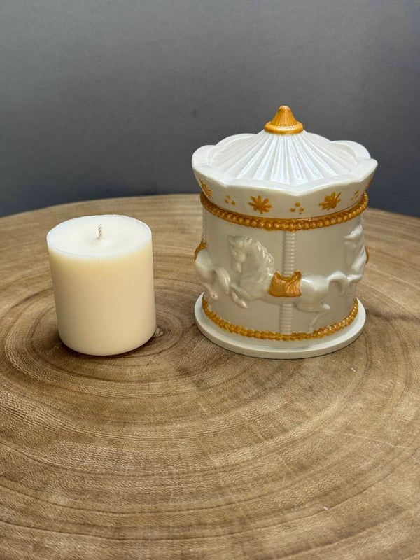 A Horse Carousel refers to a decorative, reusable candle jar handcrafted from Jesmonite, a durable, eco-friendly, and versatile material, designed in a whimsical carousel style to add a playful, nostalgic touch to a home's interior.